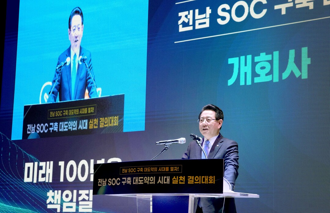 | ▲ 김영록 전라남도지사가 19일 보성 문화예술회관에서 열린 전남 SOC 구축 대도약의 시대 실천 결의대회에서 개회사를 하고 있다. [전남도 제공] |