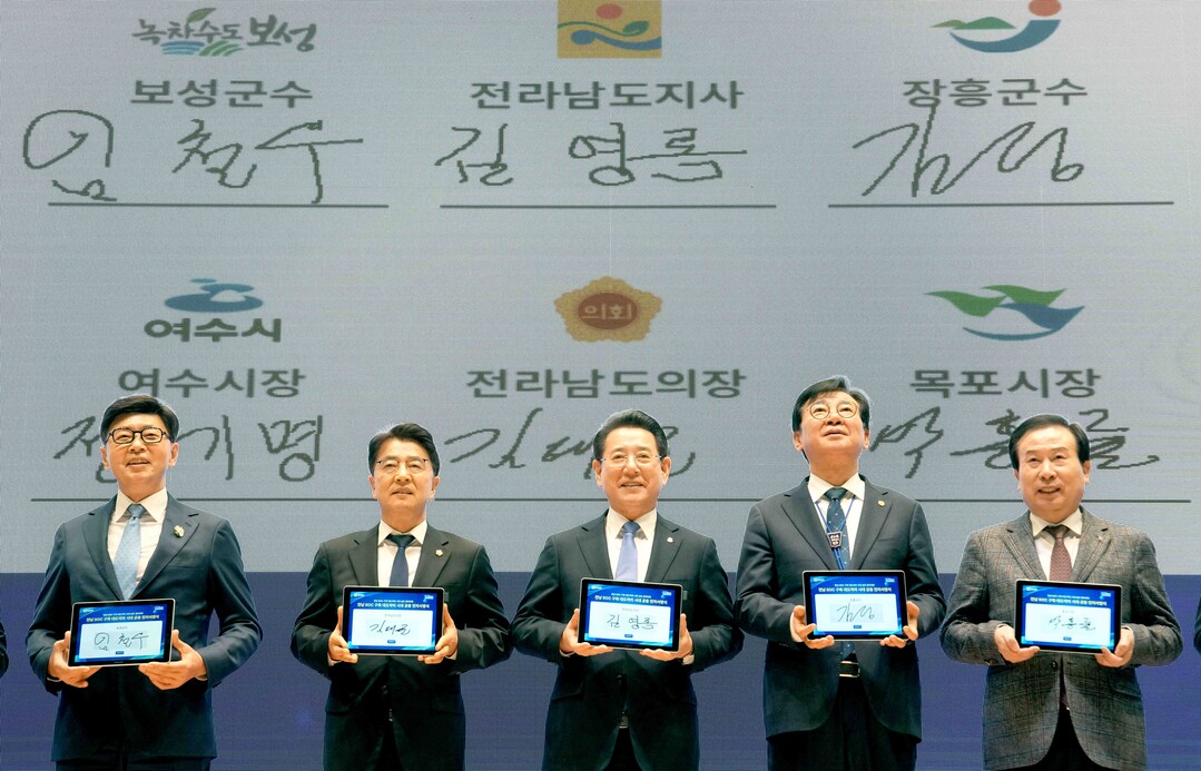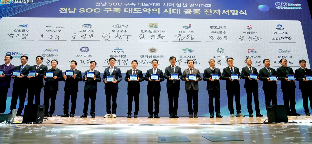 | ▲ 김영록 전라남도지사와 김태균 전남도의회 의장이 19일 보성 문화예술회관에서 열린 '전남 SOC 구축 대도약의 시대 실천 결의대회'에서 시장·군수들과 전남도 미래 100년을 이끌 핵심 SOC사업을 국가계획에 반영하기 위한 공동건의문에 서명을 하고 촬영을 하고 있다. [전남도 제공] |