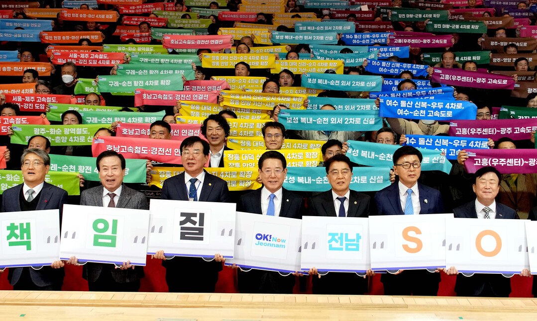 | ▲ 김영록 전라남도지사와 김태균 전남도의회 의장이 19일 보성 문화예술회관에서 열린 '전남 SOC 구축 대도약의 시대 실천 결의대회'에서 시장·군수들과 전남도 미래 100년을 이끌 핵심 SOC사업을 국가계획에 반영하기 위한 실천결의를 하고 있다. [전남도 제공] |