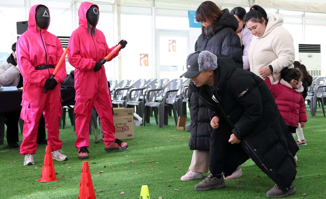 | ▲ 제53회 강진 청자축제장 청자촌에서 가족단위 관광객들이 '오징어게임 청자챌린지 최후의 승자' 게임이 참가하고 있다. 최후 생존자 1명에게는 상금으로 강진사랑상품권 45만6000원을 제공하며, 탈락자에게는 상품권 1만 원을 준다. [강진군 제공] |