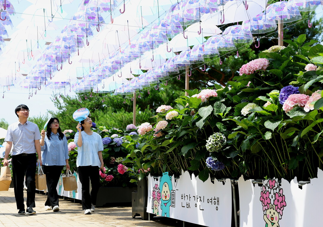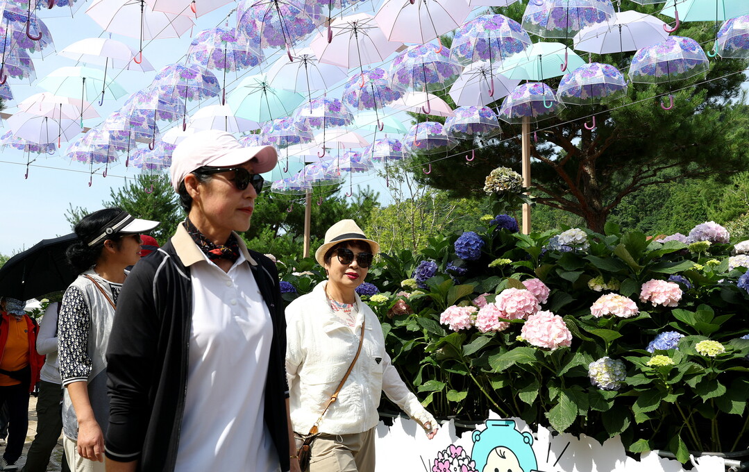| ▲ 오는 29일까지 열리는 '제3회 강진 수국길 축제'가 27일 전남 강진군 보은산 V랜드 공원에서 열린 가운데 관광객들이 형형색색의 만개한 수국길을 걸으며 치유의 시간을 보내고 있다. [강진군 제공] |