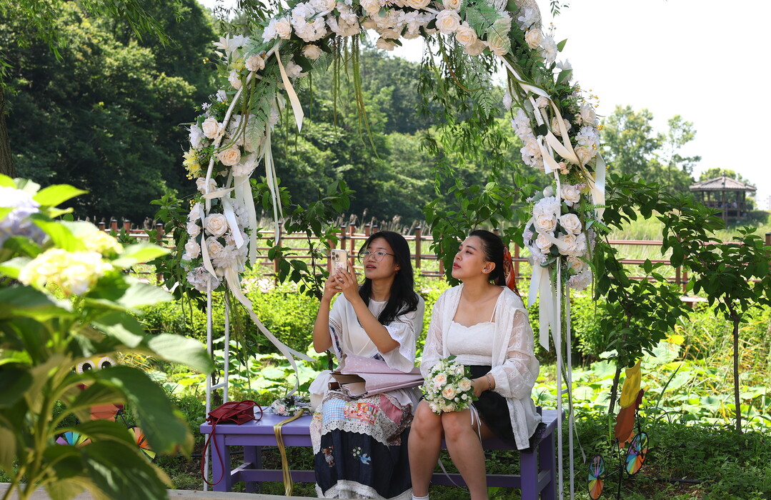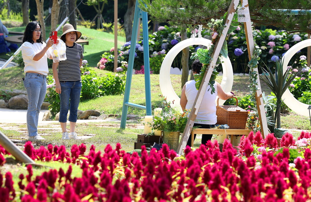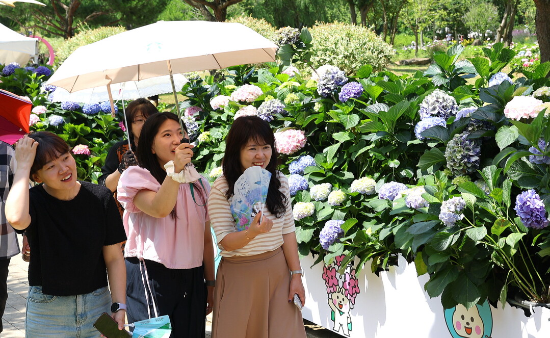 | ▲ 오는 29일까지 열리는 '제3회 강진 수국길 축제'가 27일 전남 강진군 보은산 V랜드 공원에서 열린 가운데 관광객들이 형형색색의 만개한 수국길에서 추억을 남기며 치유의 시간을 보내고 있다. [강진군 제공] |