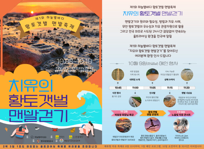 축제 기간 동안 박창동 맨발걷기국민운동본부 회장의 특강을 비롯해 나도 맨발걷기 지도자 콘테스트, 마음챙김 힐링요가 명상, 치유의 황토갯벌 맨발걷기 등 무안 갯벌의 매력을 느끼는 프로그램도 마련됐다.