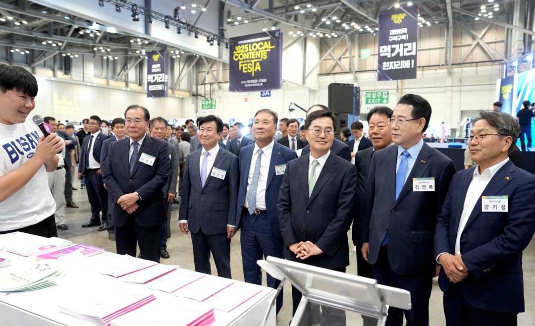 | ▲ 김영록 전라남도지사가 25일 부산 벡스코에서 개최된 '2025 로컬 콘텐츠 페스타' 행사에서 주요 내빈들과 전남홍보관을 둘러보고 있다. [전남도 제공] |