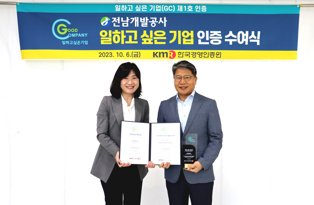 GC 인증은 누구나 일하고 싶은 최고 수준의 일터를 구현해 낸 조직을 공신력 있는 전문기관인 한국경영인증원이 심사를 통해 인증을 부여하는 제도로 전남개발공사가 ‘제1호 인증’을 받게 됐다.