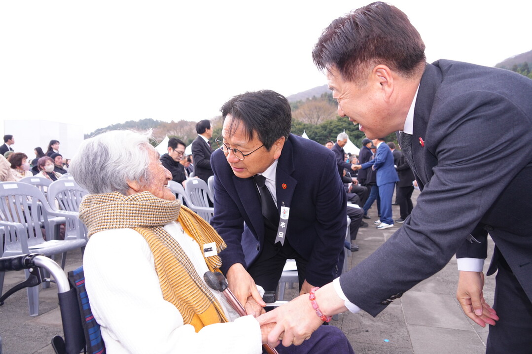 | ▲ 강기정 광주광역시장이 3일 오전 제주4·3평화공원에서 열린 '제77주년 4·3희생자 추념식'에 참석해 4·3희생자 고 양천종씨의 딸 양두영 어르신을 위로하고 있다. [광주광역시 제공] |