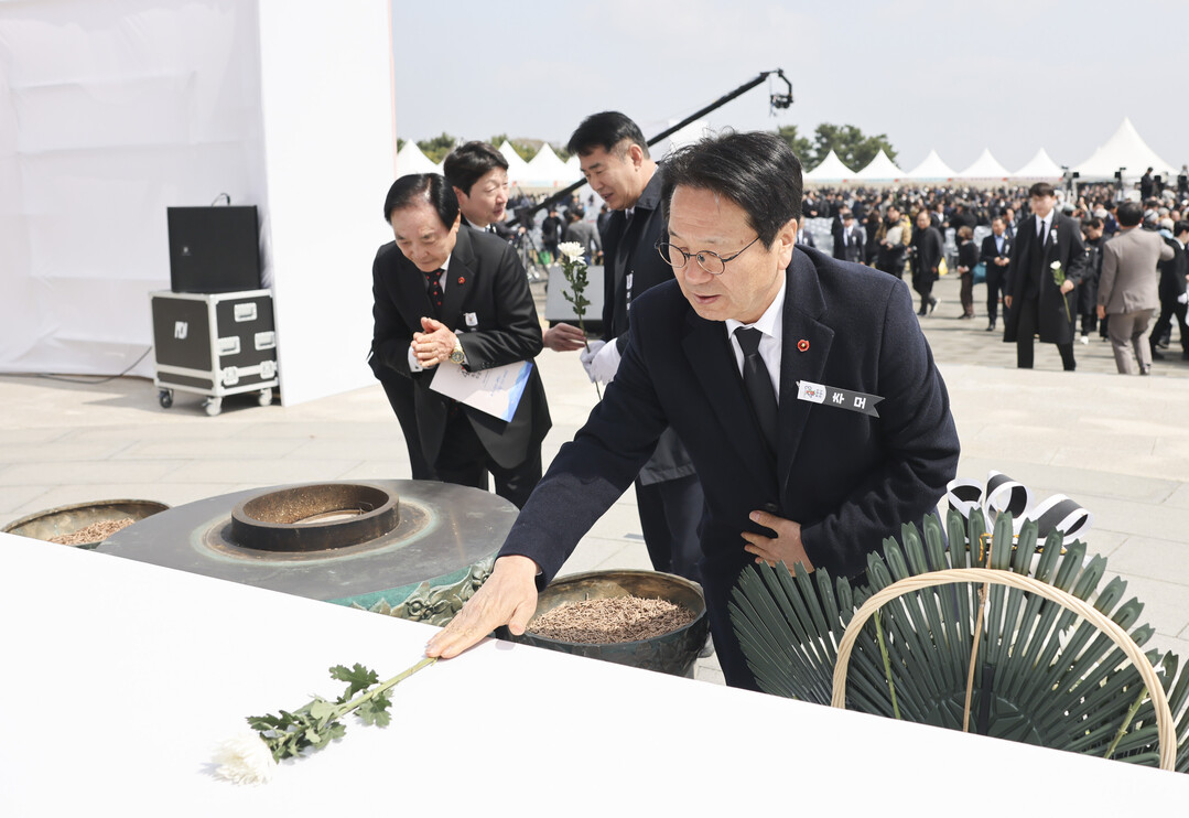 | ▲ 강기정 광주광역시장이 3일 오전 제주시 제주4·3평화공원에서 열린 '제77주년 제주 4·3 희생자 추념식'에 참석해 헌화·분향을 하고 있다. [광주광역시 제공] |