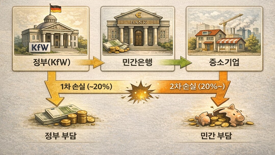 독일 정책금융기관 KfW가 대표적 사례다. KfW는 온랜딩(on-lending) 방식으로 민간 은행에 저금리 자금을 제공하고, 민간 은행이 이를 중소기업과 혁신기업에 대출한다. 핵심은 손실 분담이다. 대출 부실이 나면 정부가 일정 금액까지 먼저 손실을 떠안고, 민간 은행은 그 이후 발생한 손실만 부담하는 방식으로 운영된다.