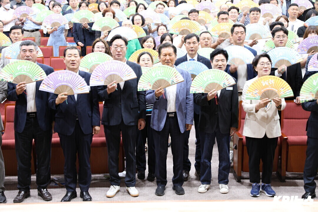 | ▲ 더불어민주당 정청래 의원이 20일 전남 무안군 남악복합주민센터에서 열린 2025 무안 교육발전특구 활성화 포럼 '미래세대를 위한 민주시민교육'이란 주제로 나광국 전남도의회 예결위원장 등 참석자와 함께 특강 전 퍼포먼스를 하고 있다. [강성명 기자] |