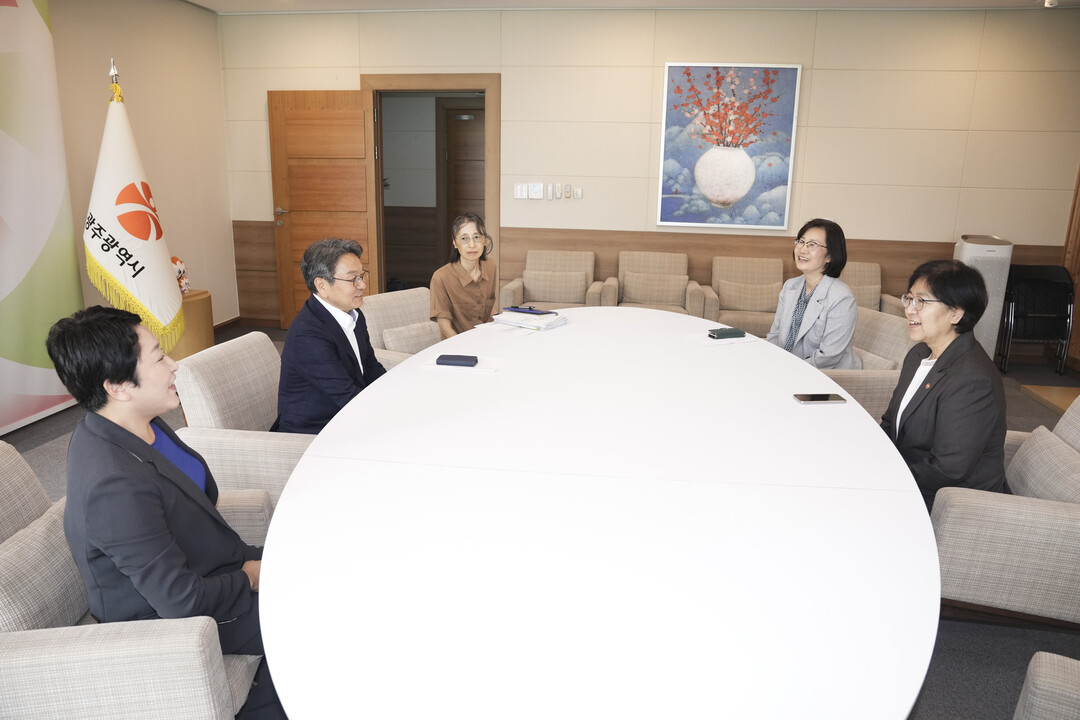 | ▲ 강기정 광주광역시장이 6일 오후 광주시 통합돌봄 정책 현장간담회 참석을 위해 시청을 방문한 정은경 보건복지부 장관과 환담을 나누고 있다. [광주광역시 제공] |