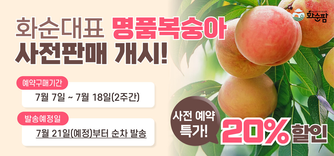 전남 화순군 농특산물 쇼핑몰인 '화순팜'에서 오는 7일부터 18일까지 명품 복숭아 20% 할인 사전 예약판매에 나선다.