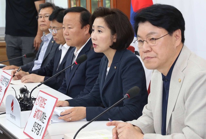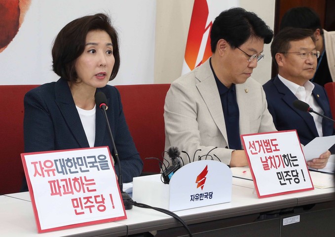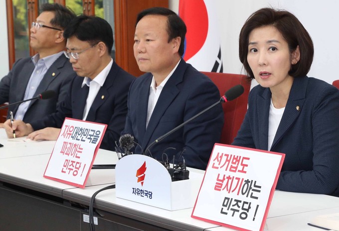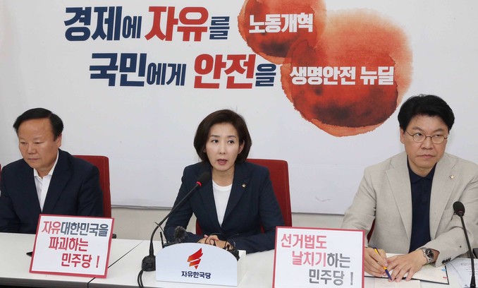자유한국당 나경원 원내대표(가운데)가 28일 오후 서울 여의도 국회에서 정개특위 관련 기자 브리핑을 하고 있다.