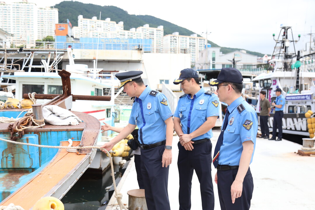 | ▲ 이명준 서해지방해양경찰청장이 1일 태풍 내습기 해양 안전사고 예방과 긴급대응 태세 강화를 위해 주요 선박 피항지 등 여수 치안현장 점검에 나서고 있다. [서해해경청 제공] |