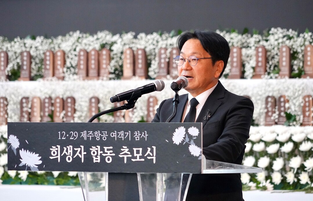 | ▲ 강기정 광주광역시장이 18일 오전 무안국제공항에서 열린 12·29 제주항공 여객기 참사 희생자 합동추모식에 참석해 추모사를 하고 있다. [광주광역시 제공] |