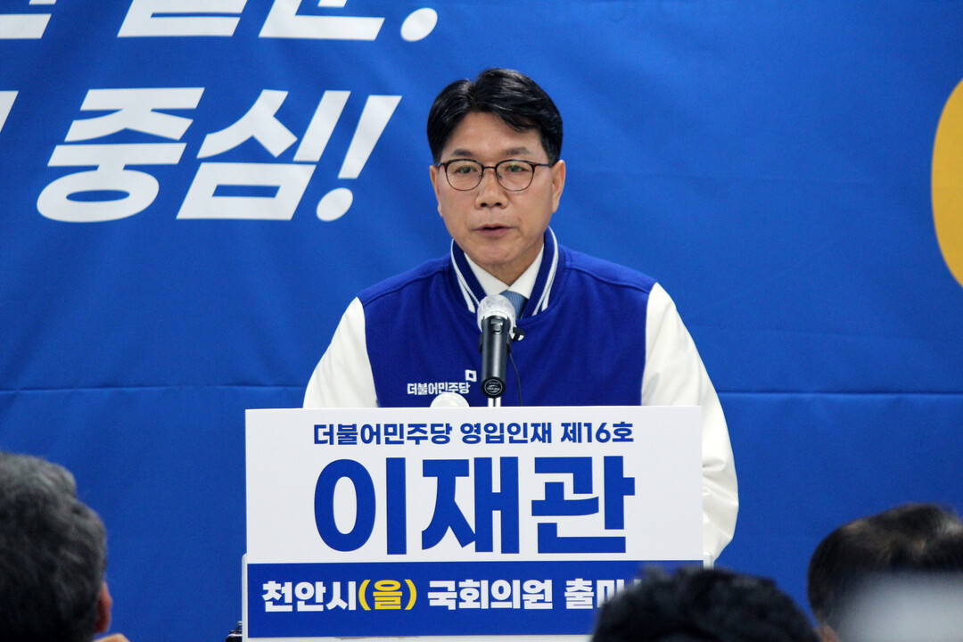 더불어민주당 이재관 예비후보가 27일 천안시청 브리핑룸에서 기자회견을 갖고 4월 총선에서 '천안을' 지역구 출마를 공식 선언했다.