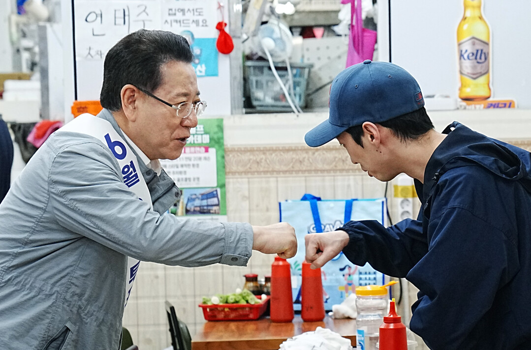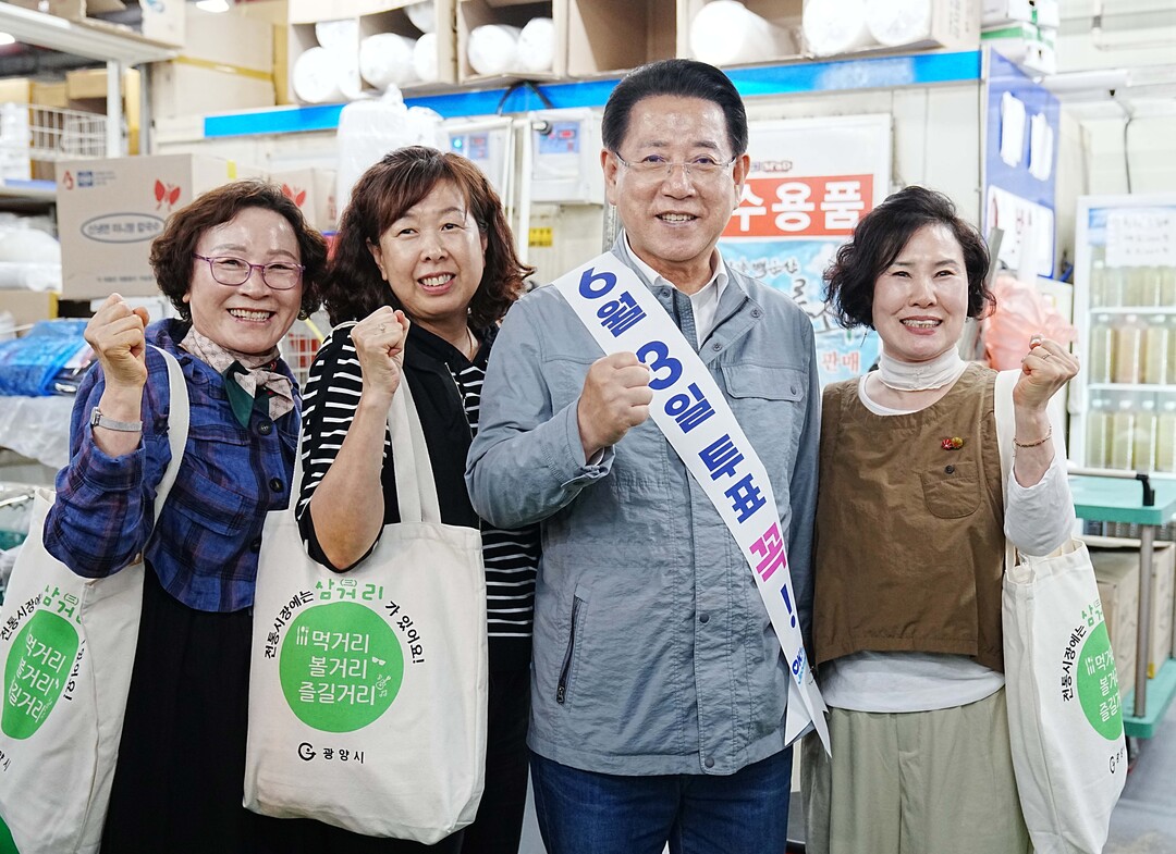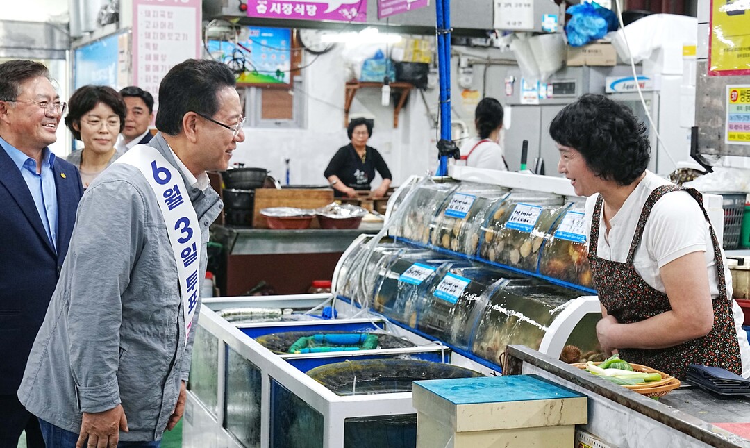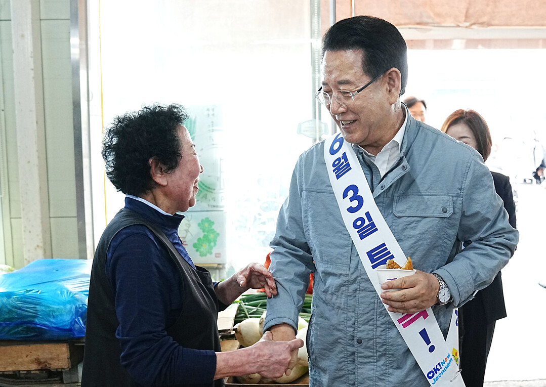 | ▲ 김영록 전라남도지사가 2일 오후 광양 중마시장에서 '제21대 대통령선거' 투표 참여를 독려하는 홍보활동을 하고 있다. [전남도 제공] |
