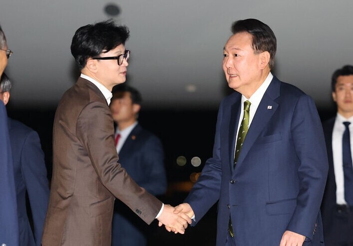 | ▲ 한·아세안 정상회의 일정 등을 마치고 귀국한 윤석열 대통령이 지난 11일 성남 서울공항에서 마중 나온 국민의힘 한동훈 대표와 인사하고 있다. [뉴시스] |