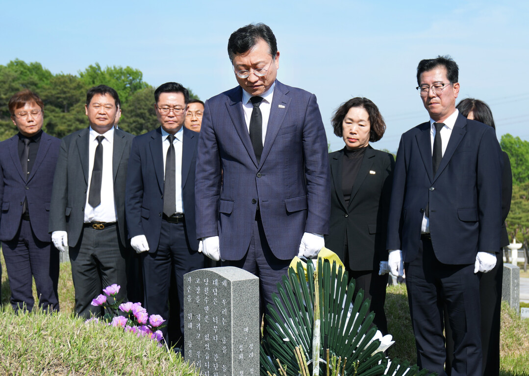 | ▲ 명창환 전라남도 행정부지사가 5·18 민주화운동 45주년을 앞둔 14일 도 실·국장과 국립 5·18 민주묘지를 방문, 고 박태조 열사 묘지에 참배하고 있다. [전남도 제공] |