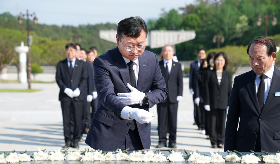 | ▲ 명창환 전라남도 행정부지사가 5·18 민주화운동 45주년을 앞둔 14일 도 실·국장과 국립 5·18 민주묘지를 방문, 오월 민주영령들에게 헌화·분향을 하고 있다. [전남도 제공] |
