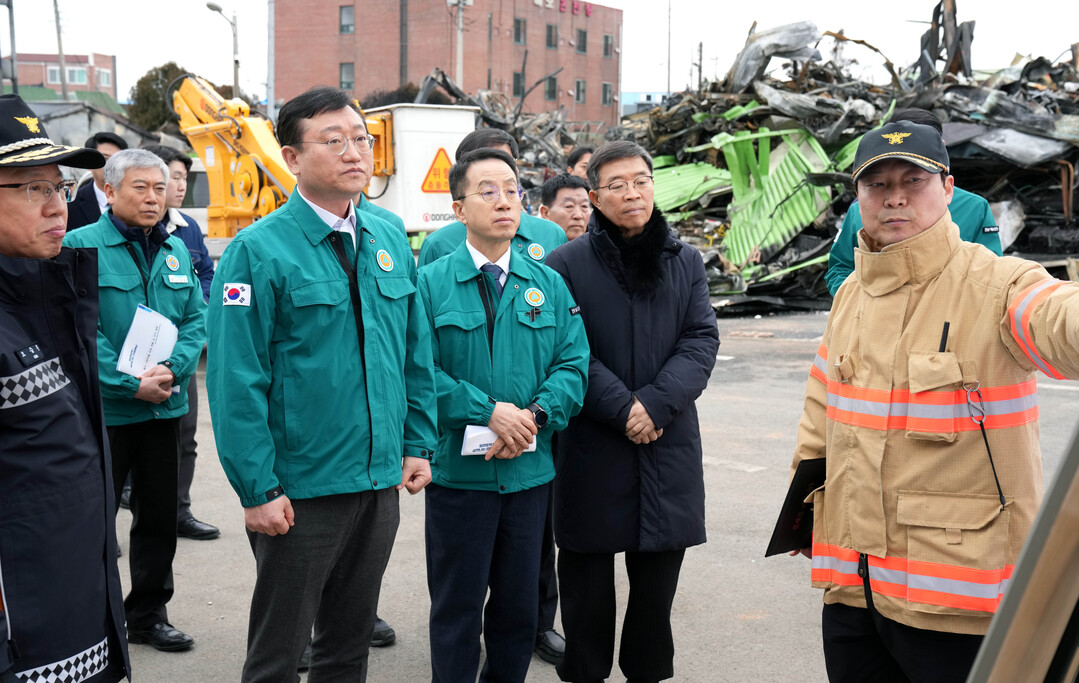 | ▲ 명창환 전라남도 행정부지사가 25일 해남 황산면 주택화재 현장을 방문, 관계자로부터 화재 발생 현황에 대해 설명을 듣고 있다. [전남도 제공] |
