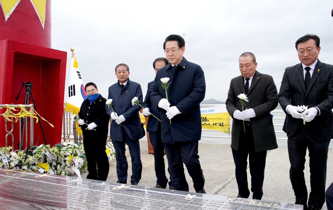 | ▲ 김영록 전라남도지사가 세월호 참사 11주기를 이틀 앞둔 14일 오후 진도군 임회면 진도항을 찾아 추모 헌화 및 묵념의 시간을 갖고 무고한 희생자의 넋을 기리고 있다. [전남도 제공] |