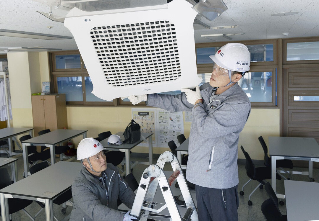 | ▲ ‘LG전자 베스크 케어 서비스’를 담당하는 하이엠솔루텍 서비스 엔지니어들이 수능 시험장에 설치된 냉·난방 시스템 에어컨 작동 이상 유무를 점검하고 있다. [LG전자 제공] |