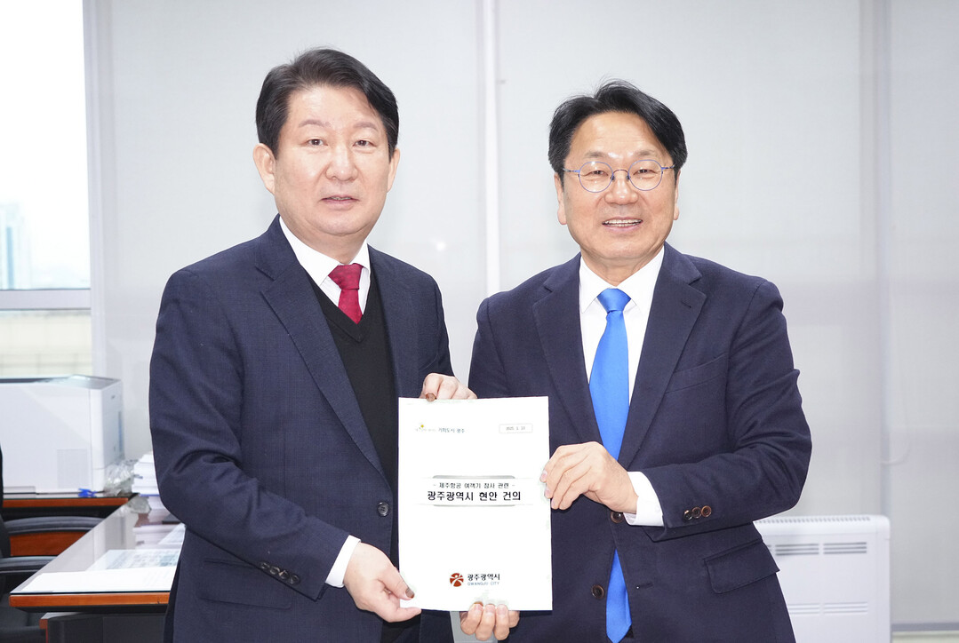 | ▲ 강기정 광주광역시장이 13일 오전 서울 국회에서 권영진 국회 제주항공여객기참사특위 위원장을 만나 제주항공 여객기참사 피해지원 특별법 제정 관련 건의서를 전달하고 있다. [광주광역시 제공] |