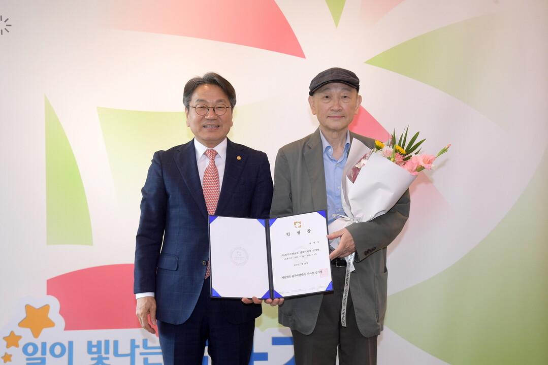 | ▲ 강기정 광주광역시장이 18일 오후 시청 접견실에서 윤범모 광주비엔날레 대표이사에게 임명장을 수여한 후 기념촬영을 하고 있다. [광주광역시 제공] |