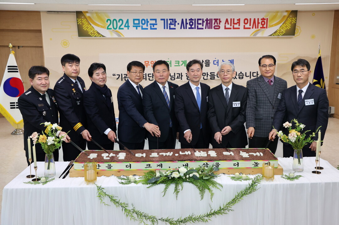 | ▲ 10일 김산 무안군수가 2024년 기관·사회단체장 신년 인사회에서 서삼석 예결위원장과 김경현 무안군의회 의장·김선치 무안교육장 등이 참석한 가운데 신년 인사회를 갖고 있다. [무안군 제공] |