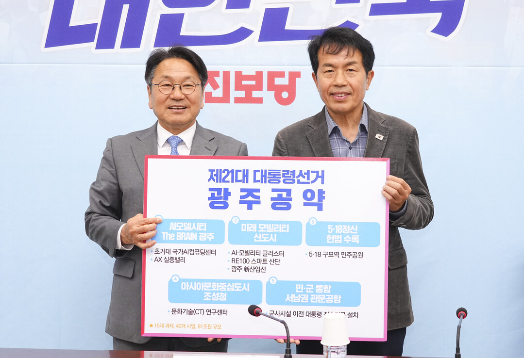 | ▲ 강기정 광주광역시장이 17일 국회에서 조국혁신당 서왕진 최고위원을 만나 광주시 21대 대통령선거 공약인 '광주의 제안'을 담은 피켓을 들고 기념촬영을 하고 있다. [광주광역시 제공] |