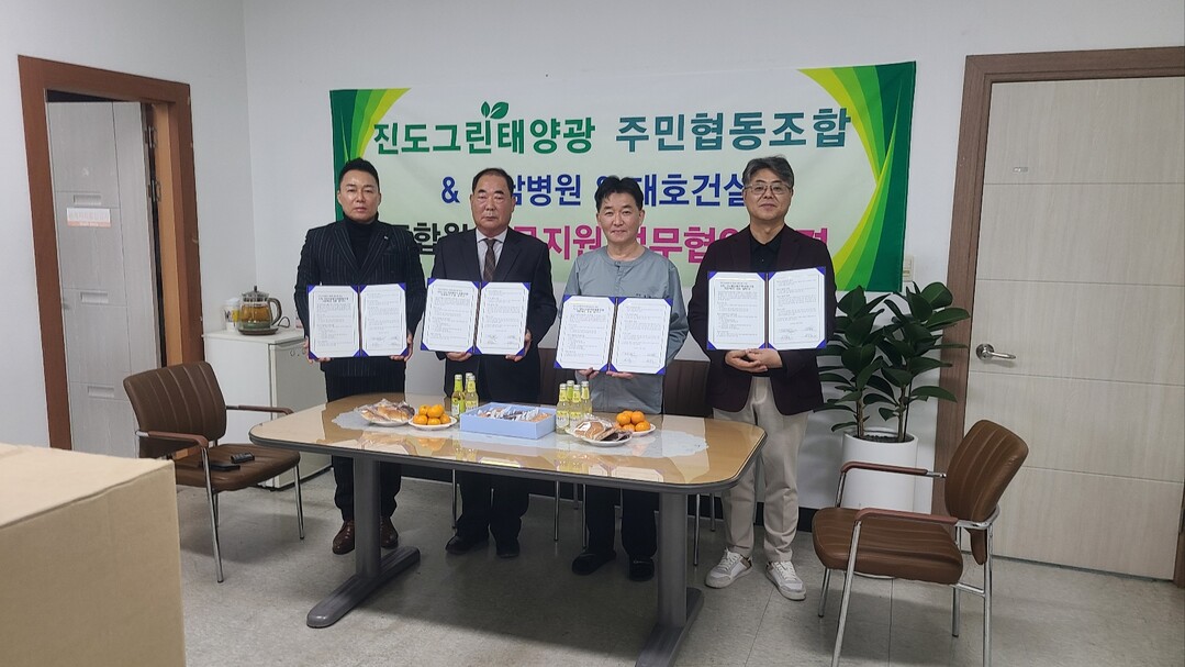 28일 진도군에 따르면 진도그린태양광주민협동조합과 (주)대호건설, 남우의료재단, 진도전남병원이 지산면 앵무리 태양광 발전 사업의 성공적 정착을 위한 '의료 복지 지원 협약서'를 지난 27일 체결했다.