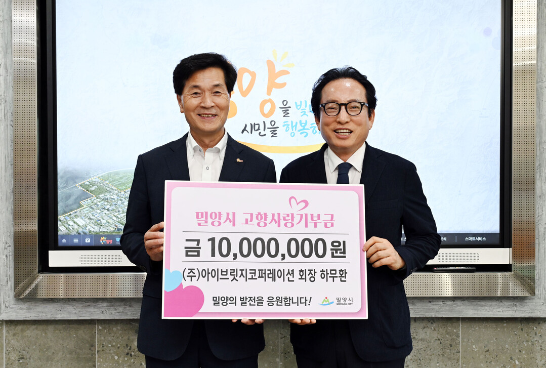 경남 밀양시는 ㈜아이브릿지코퍼레이션 하무환 회장이 27일 시청을 방문해 고향사랑기부금 1000만 원을 기탁했다고 밝혔다.