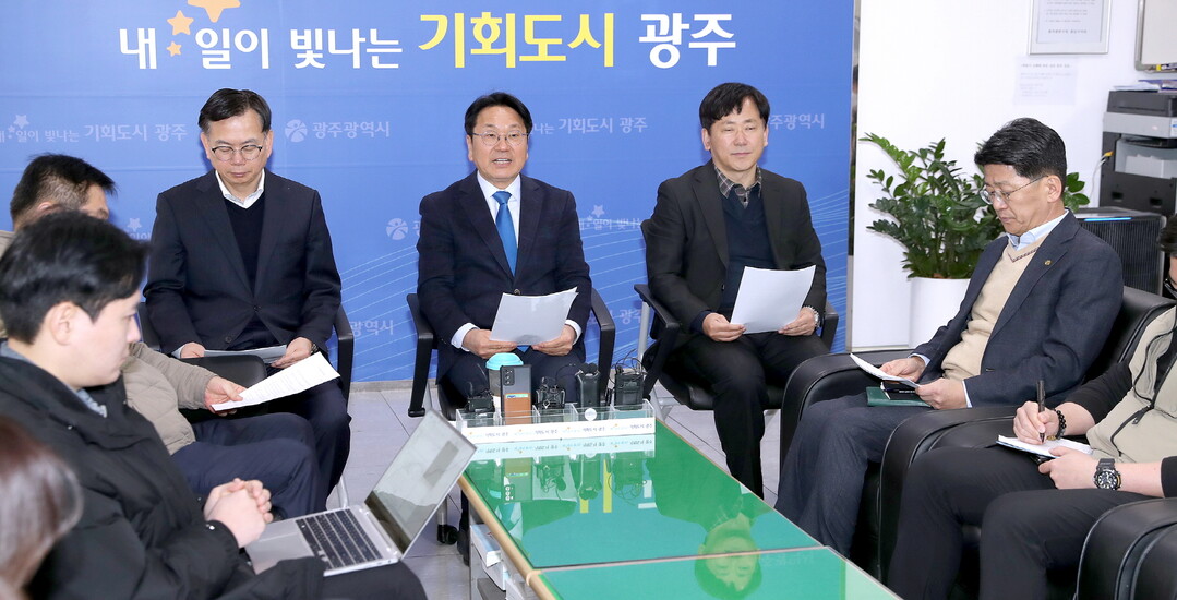 | ▲ 강기정 광주광역시장이 9일 오전 시청 5층 기자실에서 출입기자들과 차담회를 갖고 시정 주요현안 등에 대해 설명하고 있다. [광주광역시 제공] |