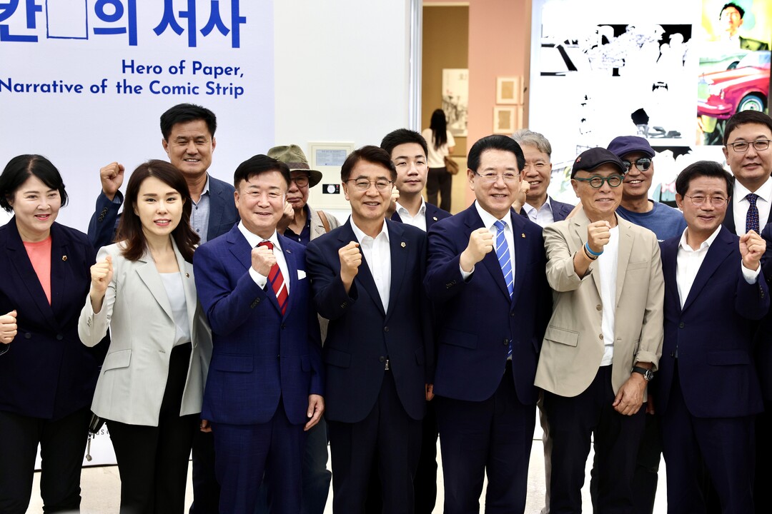 | ▲ 6일 전라남도의회 김태균(가운데) 의장이 6일 전남도립미술관에서 열린 '허영만 데뷔 50주년 기획전시' 개막식에 참석한 뒤 기념촬영을 하고 있다. [전남도의회 제공] |