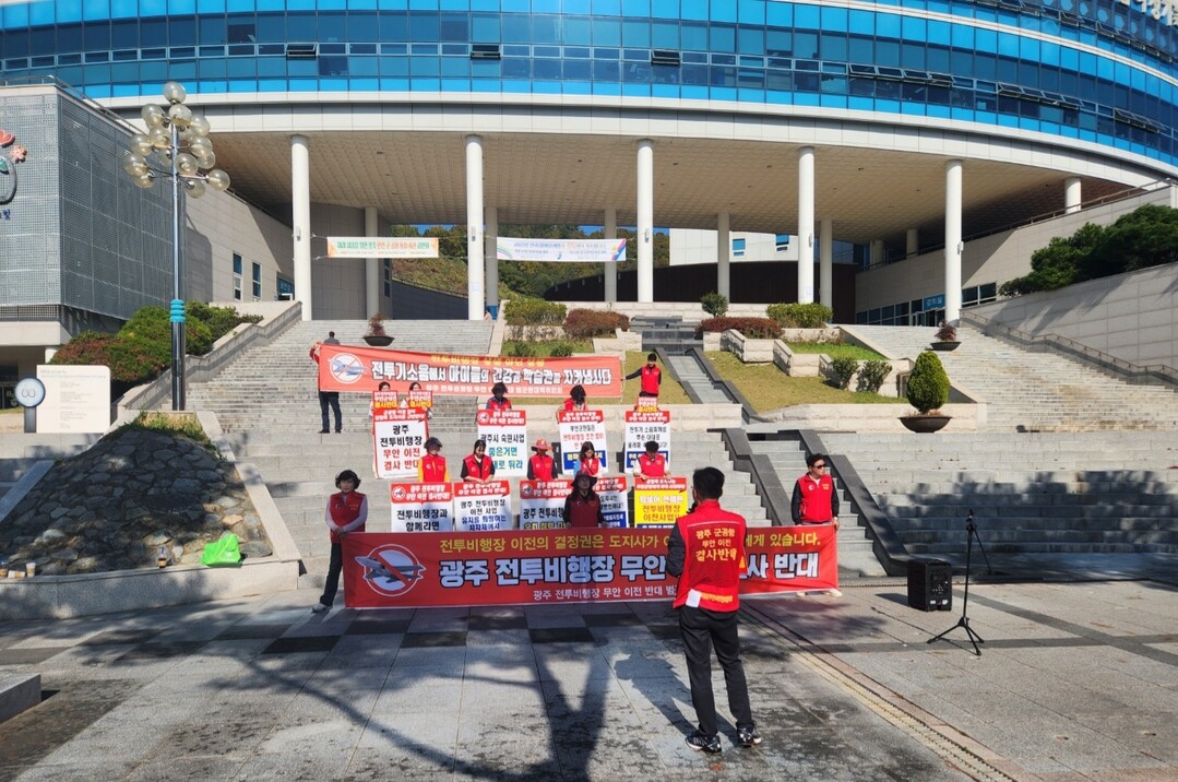 | ▲2일 광주 전투비행장 무안이전반대 범군민대책위원회가 전남여성가족재단에서 광주 군공항 여론조장 관련 성명서를 발표하고 있다. [범대위 제공] |