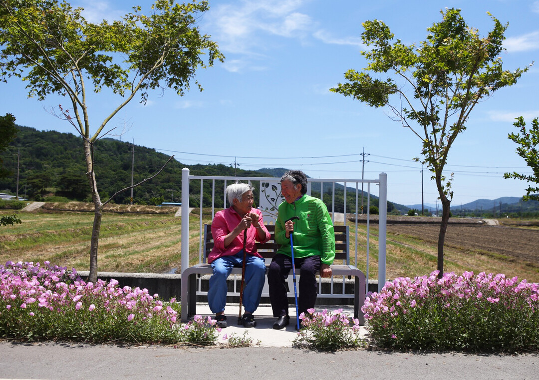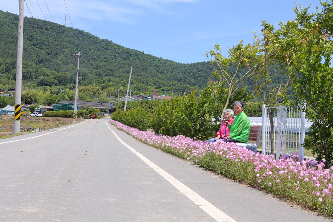 | ▲ 지난 5일 마을 주민이 '청정전남 으뜸마을 만들기' 사업으로 전남 보성군 벌교읍 옥전마을에 심은 분홍 달맞이꽃을 벗삼아 의자에 앉아 쉬어가고 있다. [보성군 제공] |