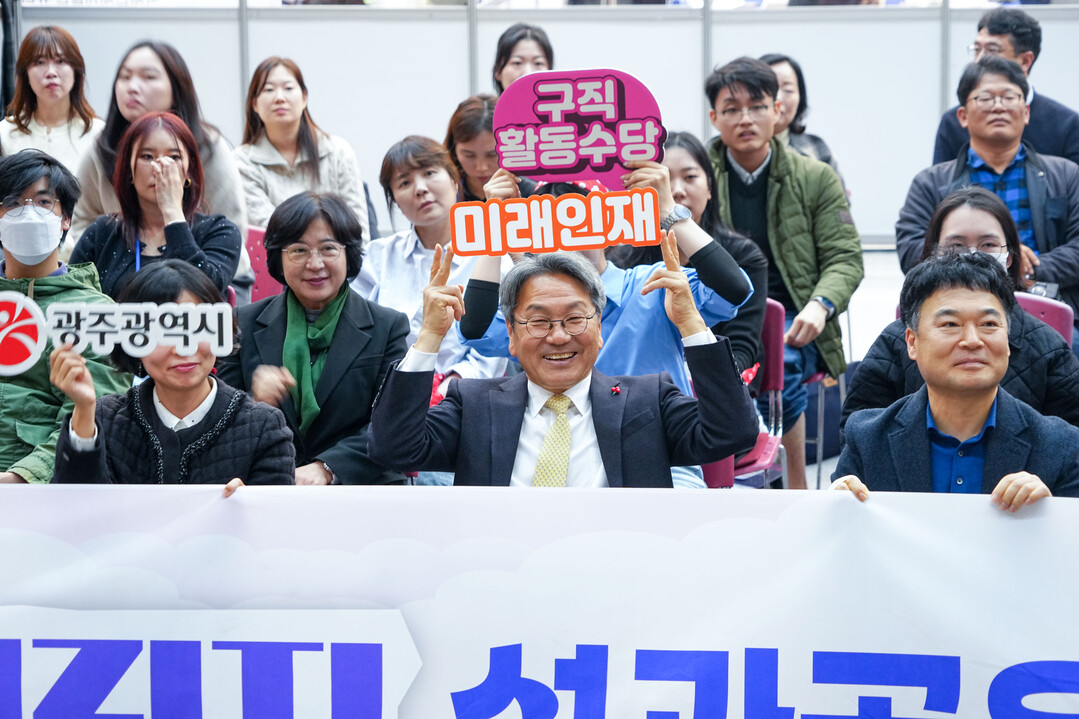 | ▲ 강기정 광주광역시장이 26일 오후 서구 김대중컨벤션센터에서 열린 광주 청년구직활동수당 지원사업 '2025 청청브릿지 성과공유회'에 참석해 청년들과 기념촬영을 하고 있다. [광주광역시 제공] |