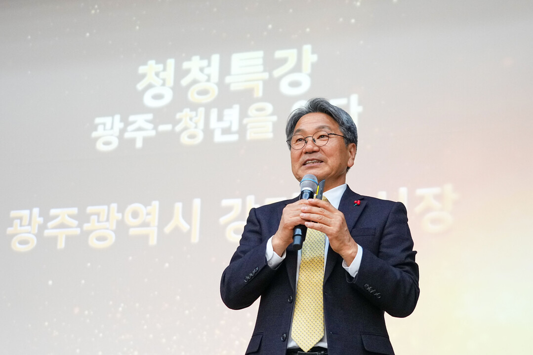 | ▲ 강기정 광주광역시장이 26일 오후 서구 김대중컨벤션센터에서 열린 광주 청년구직활동수당 지원사업 '2025 청청브릿지 성과공유회'에 참석해 특강을 하고 있다. [광주광역시 제공] |