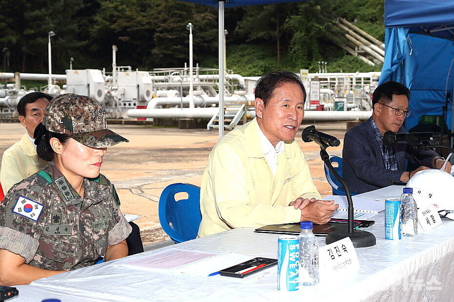 | ▲ 김동섭 사장이 재난대비 상시훈련에서 훈련개시 선언을 하고 있다. [한국석유공사 제공] |