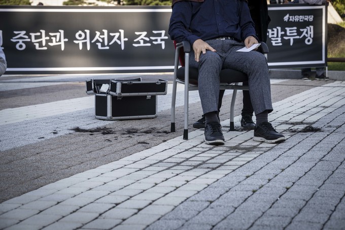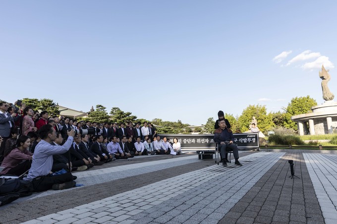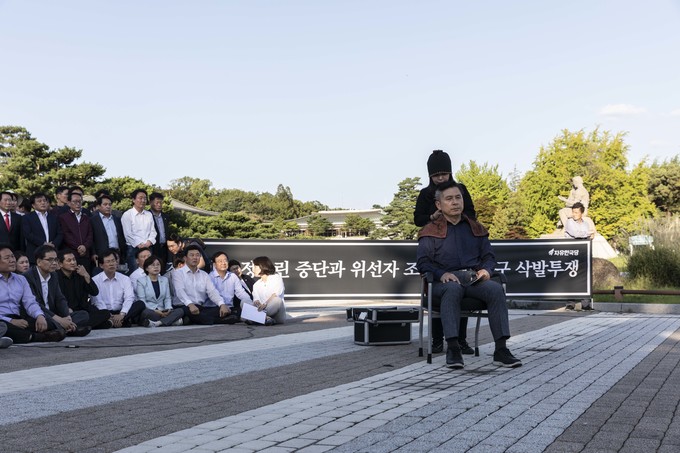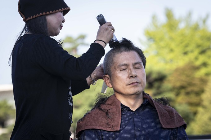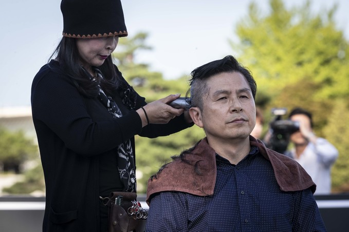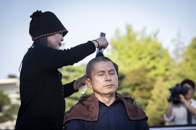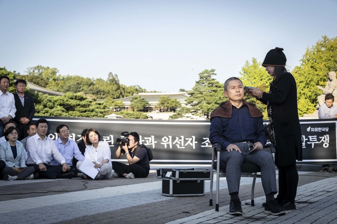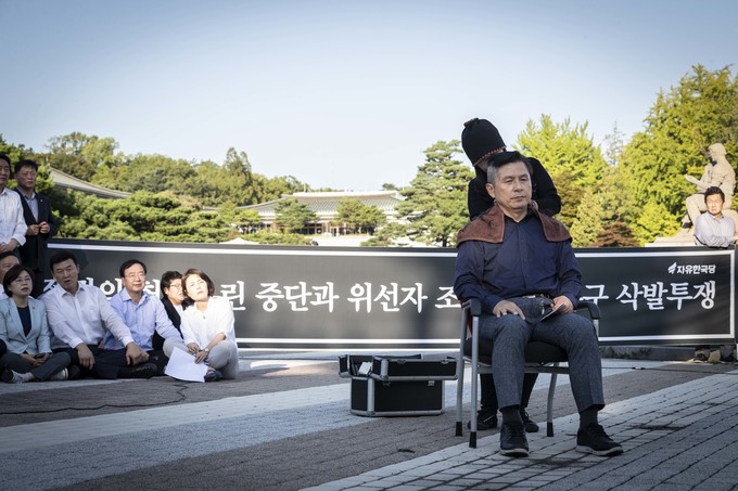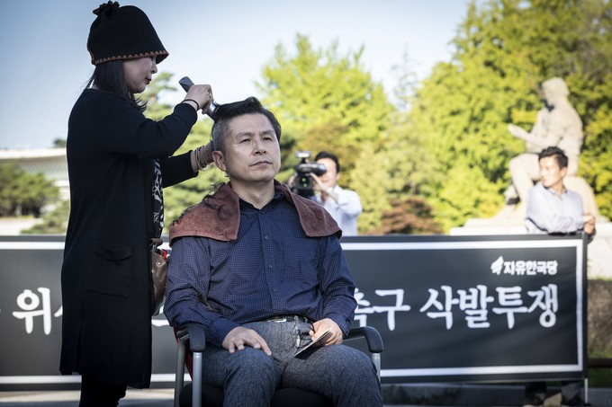 자유한국당 황교안 대표가 16일 오후 서울 종로구 청와대 앞 분수대광장에서 '문재인 정권의 헌정유린 중단과 조국 파면 촉구' 삭발투쟁을 하고 있다.