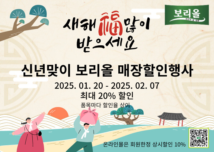 보리올은 "새해를 맞아 큰 혜택을 제공하고자 이번 행사를 준비했다"며 "매장에서나 온라인에서 찰보리의 매력을 느낄 수 있는 다양한 상품을 합리적인 가격에 만나보길 바란다"고 전했다.