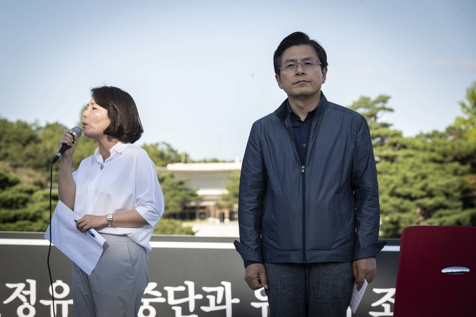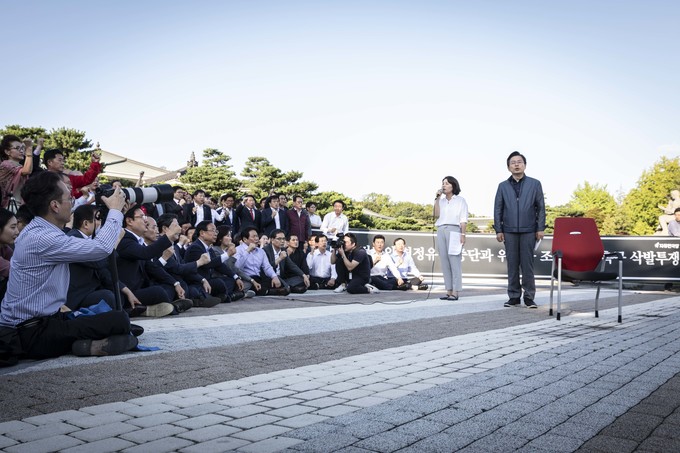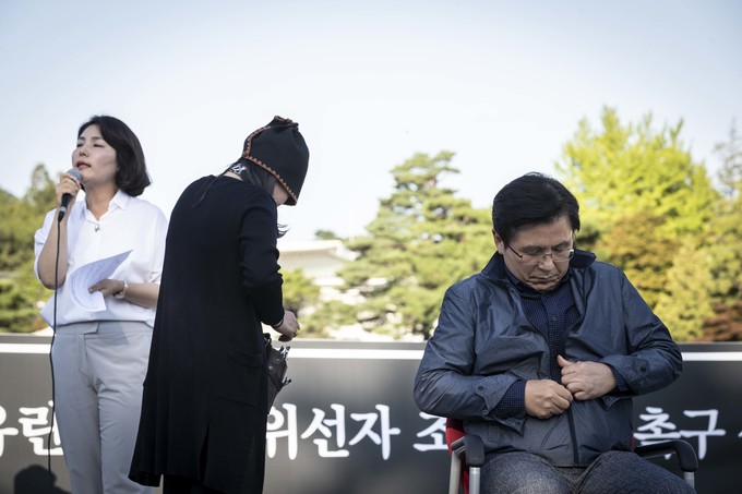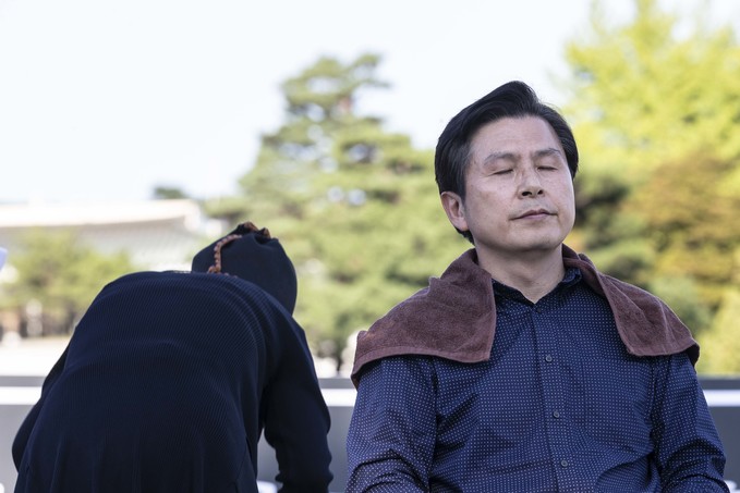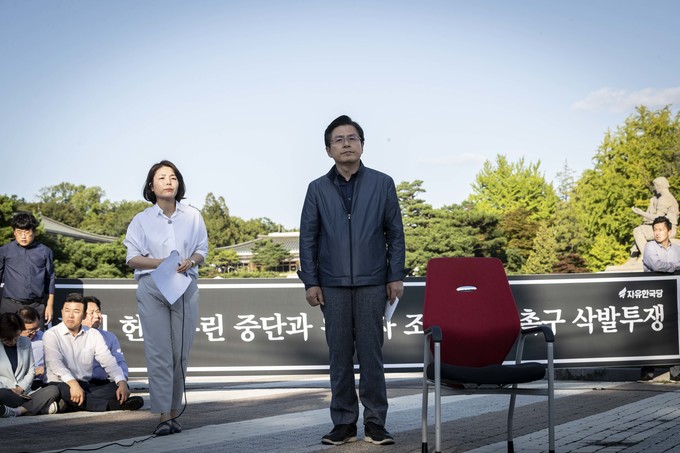 자유한국당 황교안 대표가 16일 오후 서울 종로구 청와대 앞 분수대광장에서 '문재인 정권의 헌정유린 중단과 조국 파면 촉구' 삭발투쟁을 하고 있다.