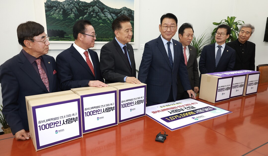 김영환 충북지사는 10일 국회를 방문해 ‘중부내륙연계발전지역 지원에 관한 특별법 연내 제정 촉구 100만인 서명부’를 김교흥 행정안전위원장에게 전달하고 적극 지원을 요청했다.