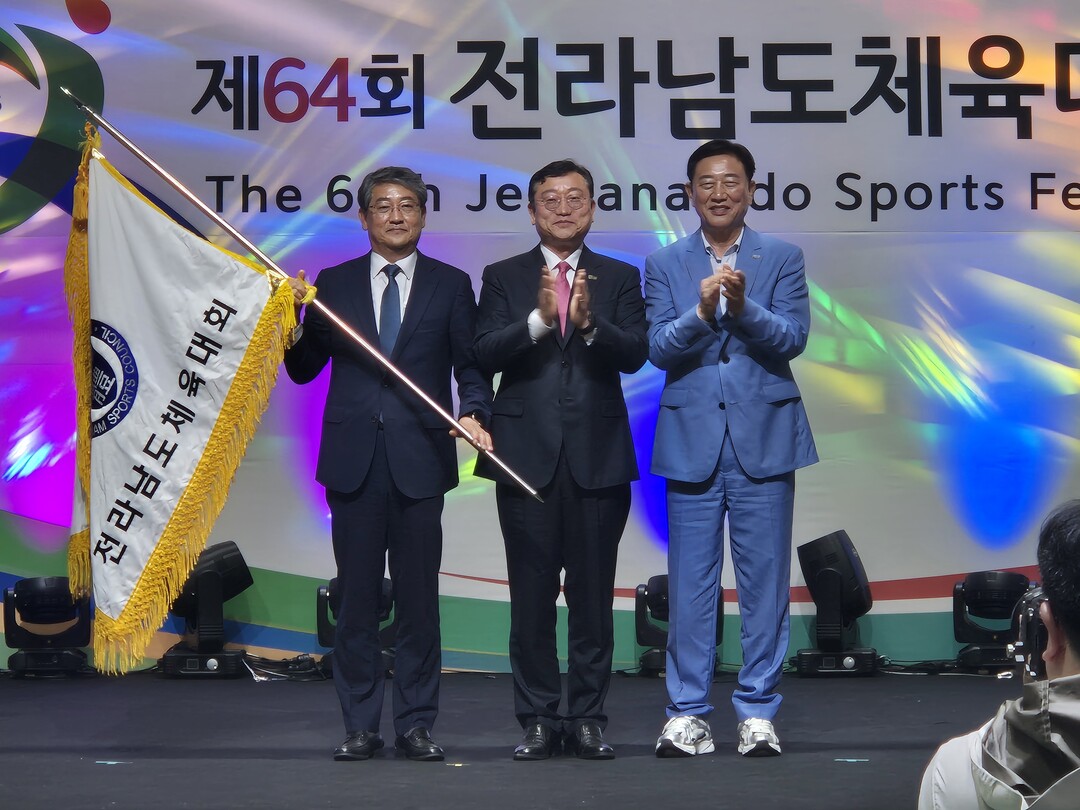 | ▲ 제64회 전라남도체육대회 개최지 단체장인 김한종(오른쪽) 장성군수가 명창환(가운데) 전남도 행정부지사가 참석한 가운데 다음 개최지인 구례군의 수장인 김순오 구례군수에게 대회기를 전달한 뒤 기념촬영을 하고 있다. [전남도 제공] |