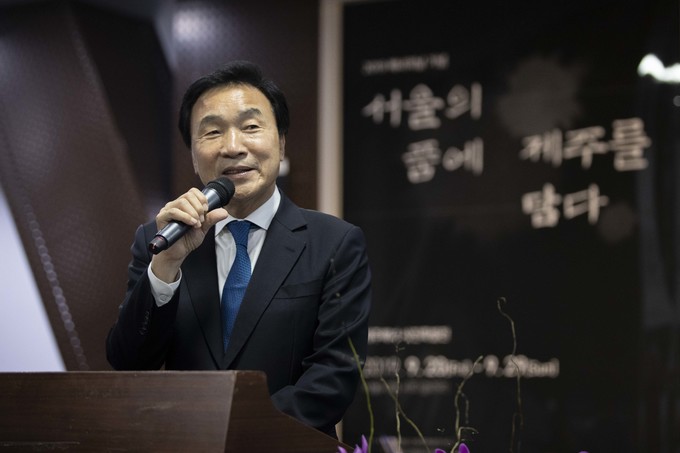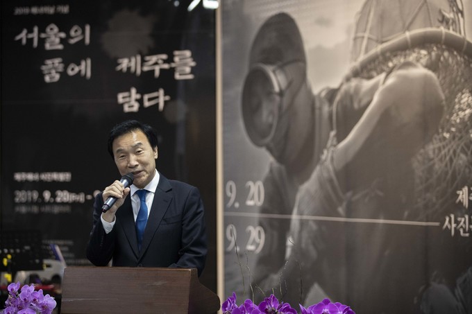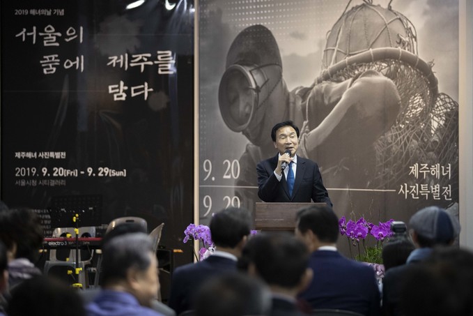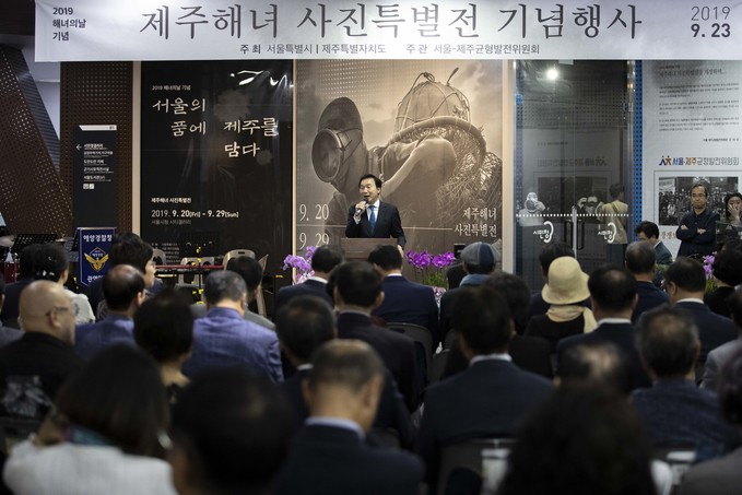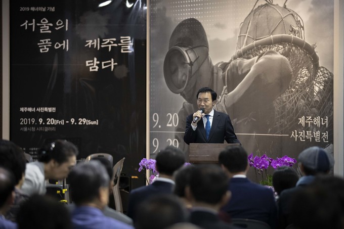 바른미래당 손학규 대표가 23일 오후 서울시청에서 열린 '2019 해녀의 날 기념 서울의 품에 제주를 담다' 사진전에 참석해 축사를 하고 있다. 이번 전시회는 유네스코에 등재된 한국의 19번째 인류무형문화유산인 제주 해녀들의 삶과 애환, 생활과 문화를 사진가 양종훈 (상명대학교 교수)이 사진으로 생생하게 기록한 이미지텔링 전시이다.