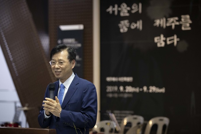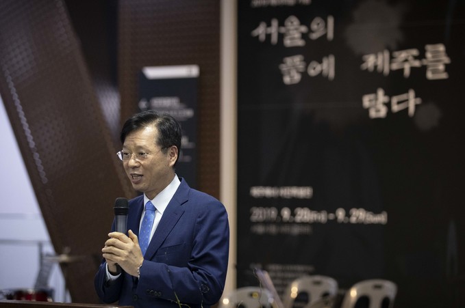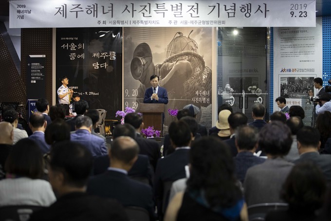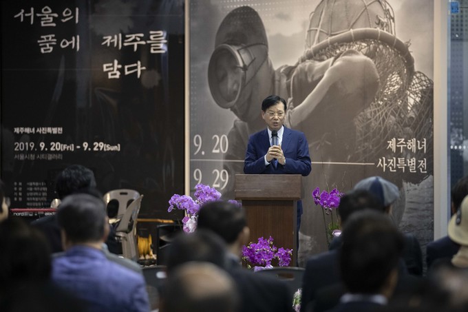 조현배 해양경찰청장이 23일 오후 서울시청에서 열린 '2019 해녀의 날 기념 서울의 품에 제주를 담다' 사진전에 참석해 축사를 하고 있다. 이번 전시회는 유네스코에 등재된 한국의 19번째 인류무형문화유산인 제주 해녀들의 삶과 애환, 생활과 문화를 사진가 양종훈 (상명대학교 교수)이 사진으로 생생하게 기록한 이미지텔링 전시이다.