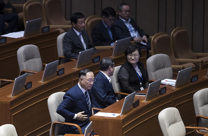 홍남기 경제부총리 겸 기획재정부 장관이 24일 오후 서울 영등포구 국회의사당에서 열린 제369회국회(임시회) 제1차 본회의에 참석하고 있다.