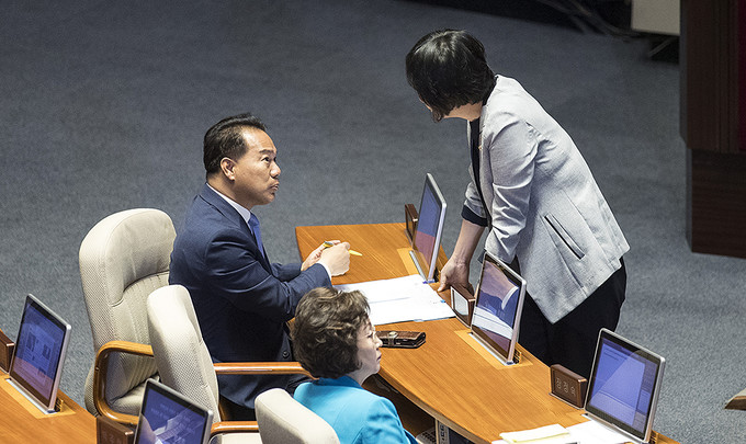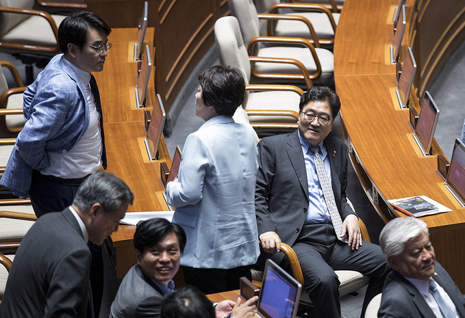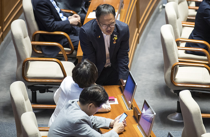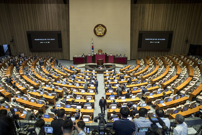 24일 오후 서울 영등포구 국회의사당에서 제369회국회(임시회) 제1차 본회의가 열리기 전 국회의원들이 본회의장에 들어서고 있다.