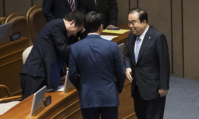 문희상 국회의장이 24일 오후 서울 영등포구 국회의사당에서 제369회국회(임시회) 제1차 본회의가 열리기 전 이낙연 국무총리와 인사를 하고 있다.