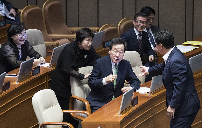 이낙연 국무총리가 24일 오후 서울 영등포구 국회의사당에서 제369회국회(임시회) 제1차 본회의가 열리기 전 국회의원들과 대화를 나누고 있다.